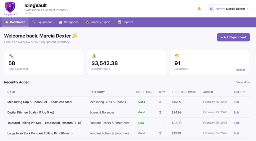 IcingVault is a bakery equipment inventory tracker built for home bakers and cottage food operators. Not a general spreadsheet template you have to wrestle into shape. Not a big expensive software suite built for commercial kitchens. Something that actually makes sense for the way we work — where “inventory” means cookie cutters organized by season, silicone molds by cavity count, and cake pans by size and finish.